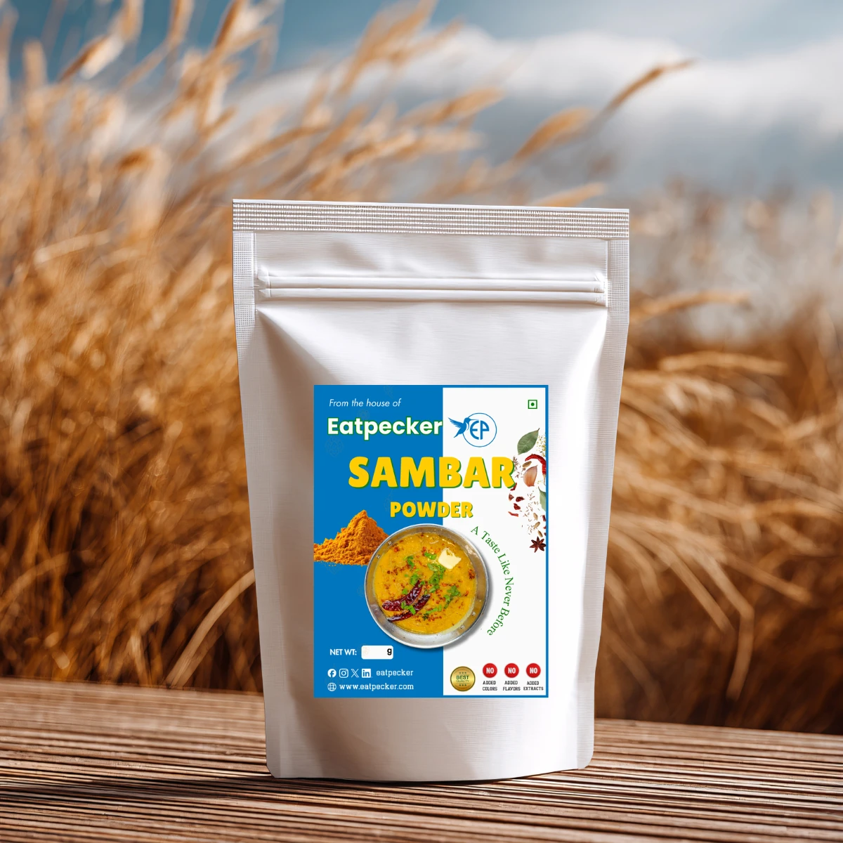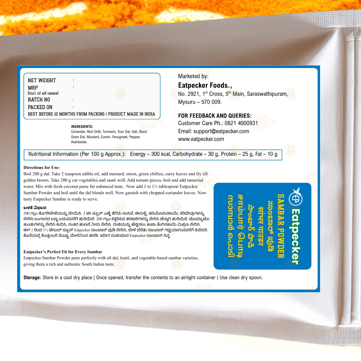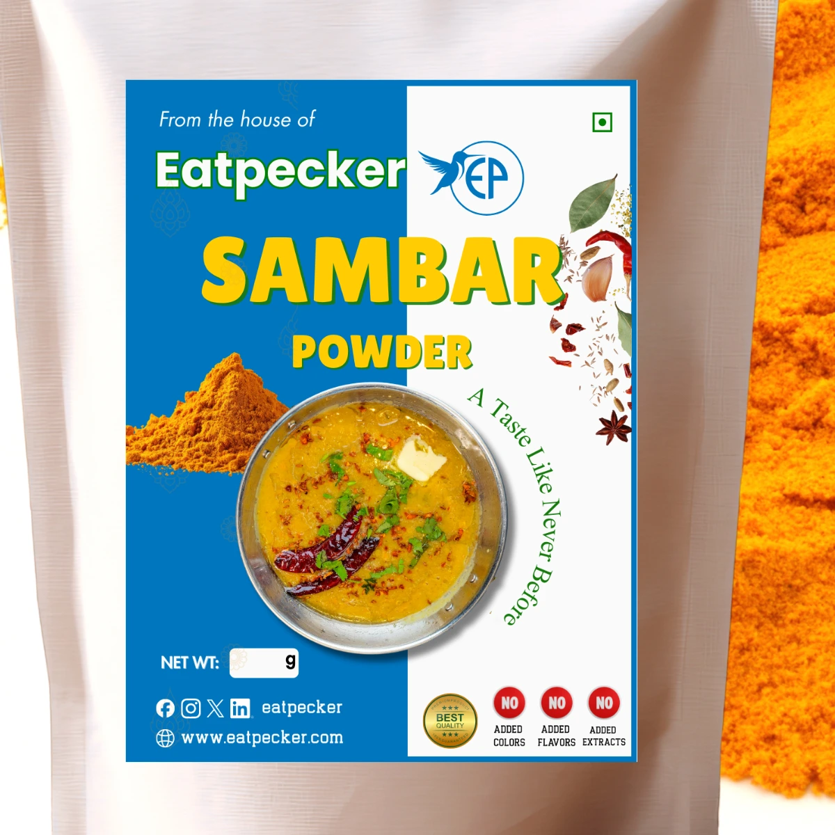 Boil 200 g dal. Take 2 teaspoon edible oil, add mustard, onion, green chillies, curry leaves and fry till golden brown. Take 200 g cut vegetables and sauté well. Add tomato pieces, boil and add tamarind water. Mix with fresh coconut paste for enhanced taste.. Now add 1 to 1½ tablespoon Eatpecker Sambar Powder and boil until the dal blends well. Now garnish with chopped coriander leaves. Now tasty Eatpecker Sambar is ready to serve. - Versatile Usage: